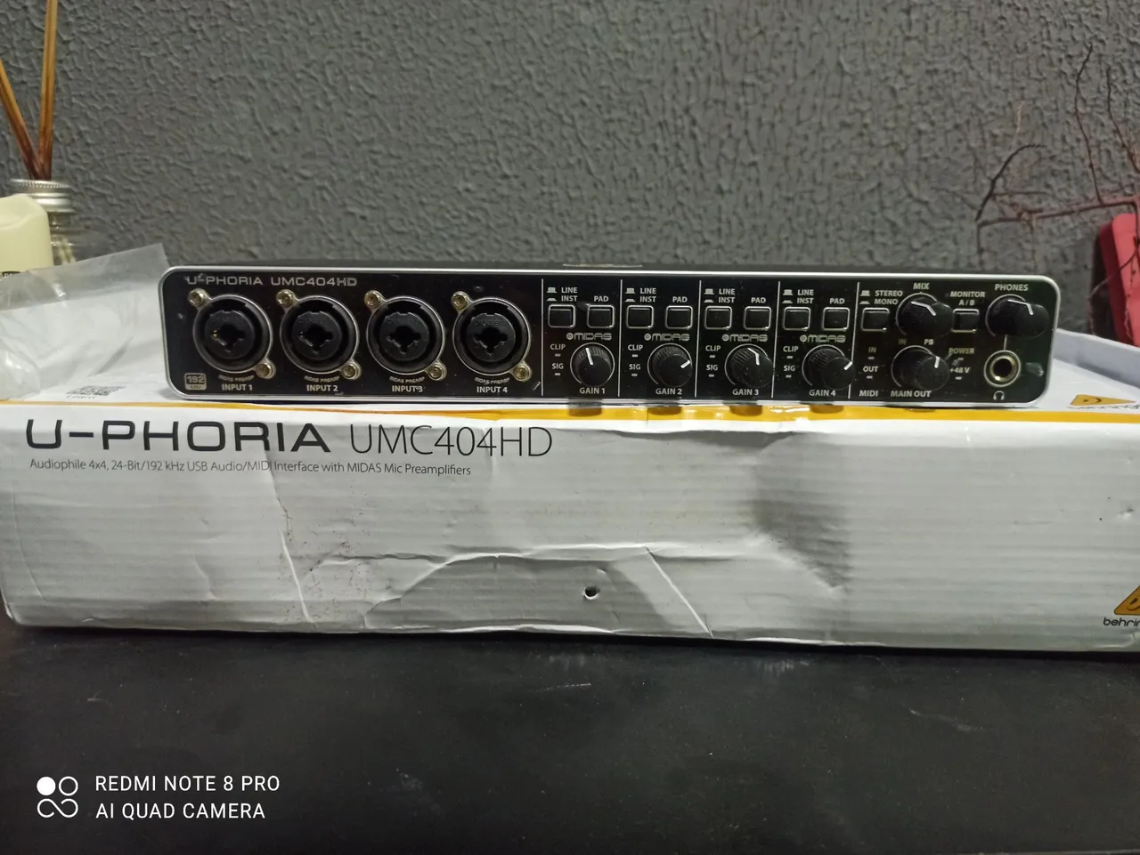 interface de áudio USB/MIDI Behringer U-Phoria UMC404HD. Trata-se de um mini estúdio que permite a gravação de áudio com alta qualidade, ideal para músicos, produtores e podcasters.