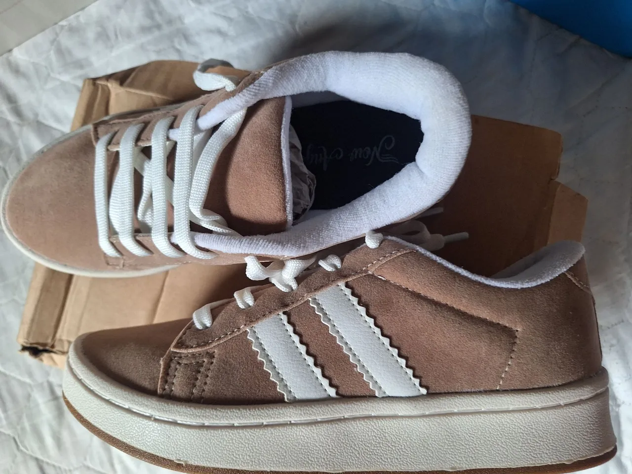 Tênis casual feminino na cor bege com detalhes em branco. Design moderno e confortável para o dia a dia. Perfeito para um visual estiloso e despojado.