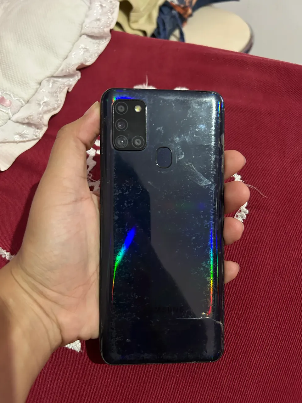 Galaxy A21s com tudo funcionando. Tela trincada (só 1 fio) mas não interfere em nada. Com algumas marcas de uso. Acompanha capa e película.