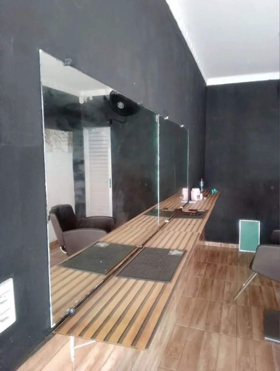 ) 1 - cadeira ( falta por o óleo hidráulico) 3 - bancadas de vidros ( envelopadas de amadeirado ) 1 - lixeira 2 - espelhos grandes 2 - tapetes para bancada