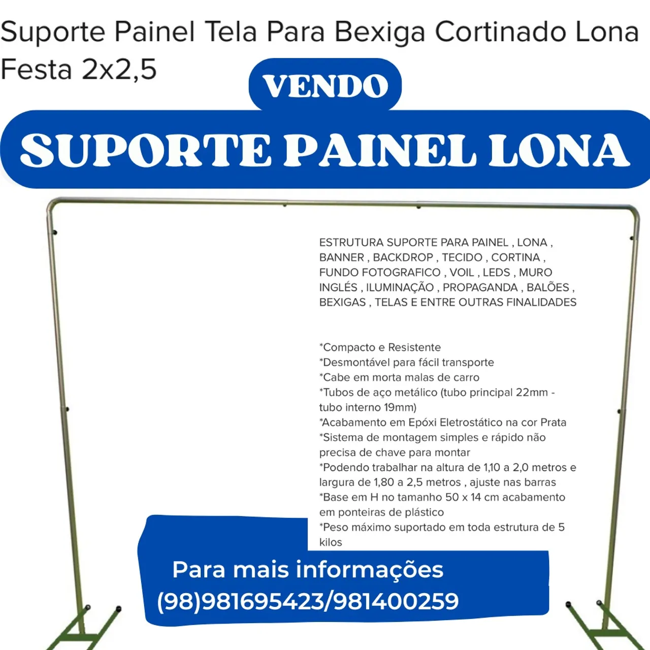 Suporte de painel lona perfeito para suas festas e eventos! Estrutura resistente e fácil de montar, ideal para banners, cortinas, fotos e muito mais. Ajustável e compacto, cabe em qualquer lugar. Leve já o seu!