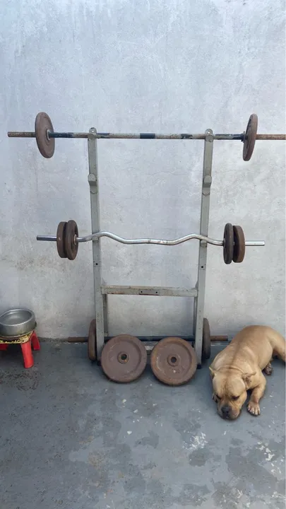 Vendo 70kg de anilhas e 3 barras. 4 anilhas de 10kg 6 anilhas de 5kg 2 barras reta 1 w Aceito cartão de credito