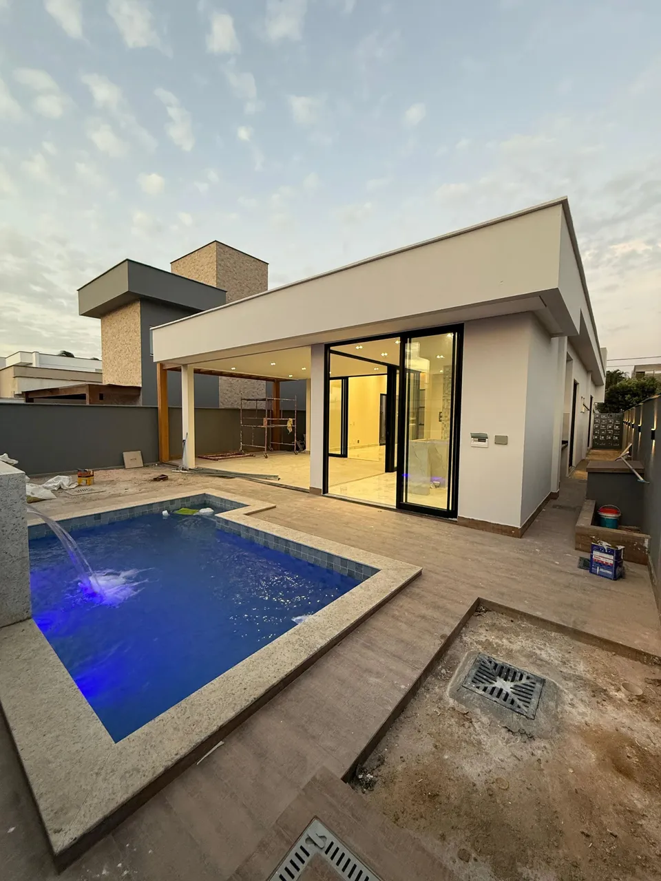 Casa com 180m² de area construída, lado nascente, possui 3 suites, com projetados, com 2 vagas de garagem. Area de lazer completa com piscina com cascata.
