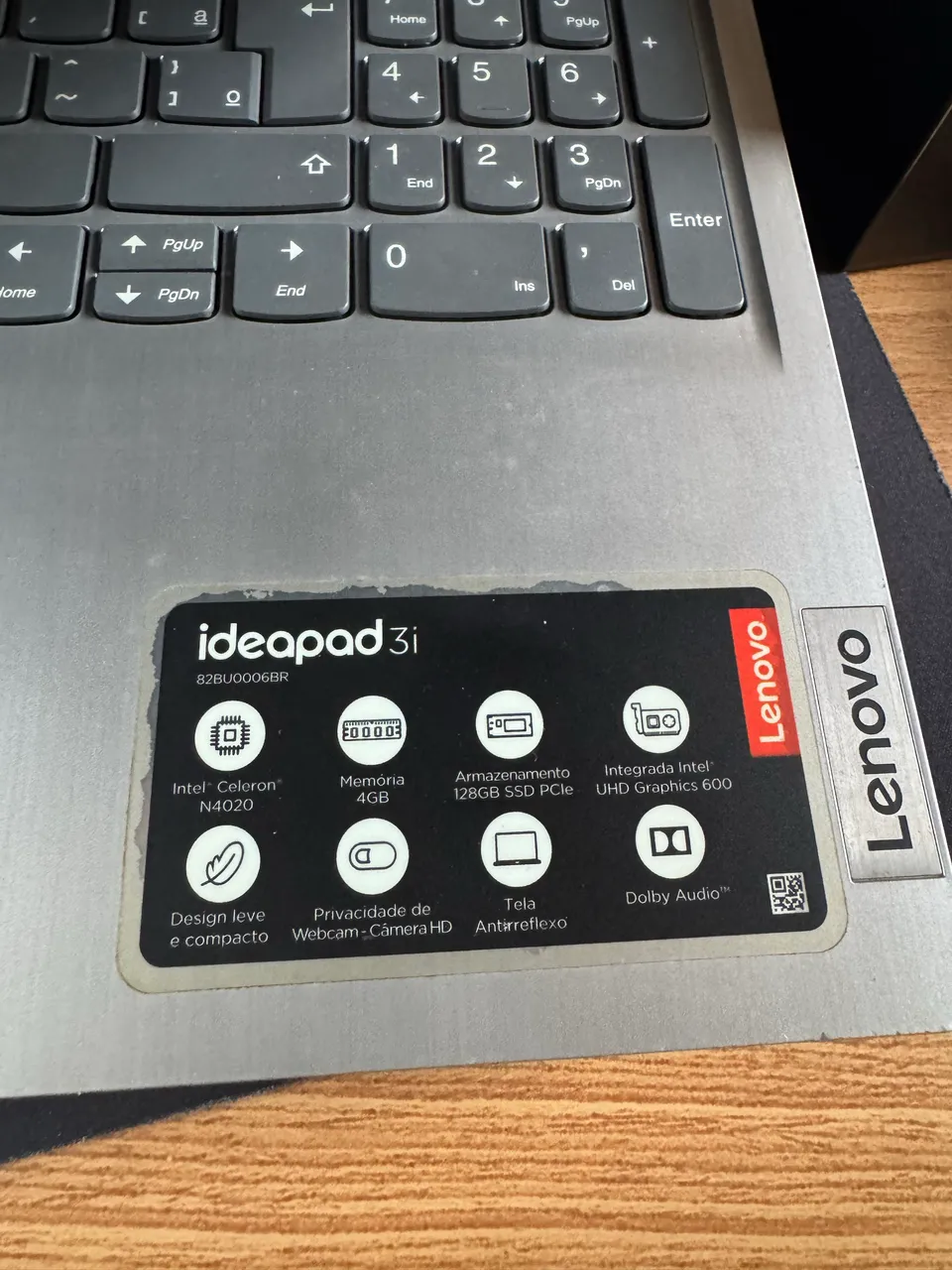 Notebook Lenovo Ideapad 3i, com design leve e compacto, tela antirreflexo e webcam com privacidade HD. Equipado com processador Intel Celeron N4020, 4GB de memória RAM e armazenamento SSD de 128GB. Desfrute de áudio Dolby para uma experiência sonora imersiva.