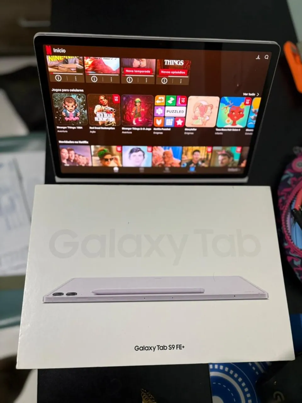 Samsung Galaxy Tab S9 FE+, tela com 12,4 polegadas, 128GB de memória expansível com sd card e 8GB de RAM. Funcionando perfeitamente, poucas marcas de uso, com capa, caixa, caneta S-Pen, carregador e nota fiscal. Estou vendendo pois ganhei um Tab S10 FE+ :)
