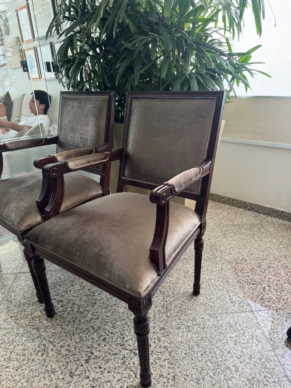 Duas cadeiras clássicas de composição em madeira com assento e encosto revestidas em camurça na cor capuccino. Perfeitas para dar um toque de elegância e sofisticação ao seu ambiente.