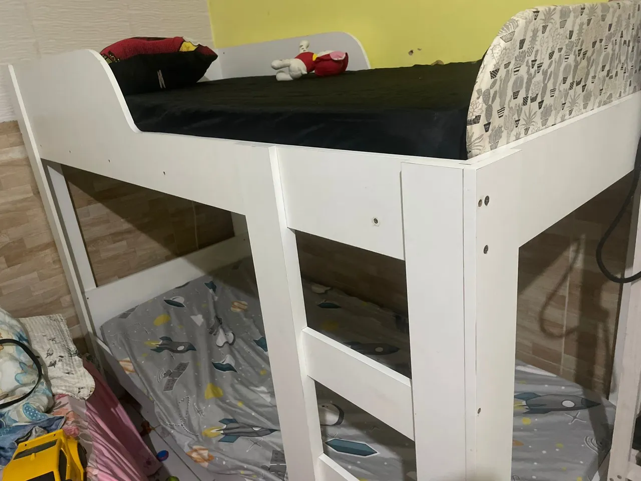 Cama beliche branca, perfeita para otimizar o espaço do quarto. Design moderno e funcional, ideal para quartos infantis.