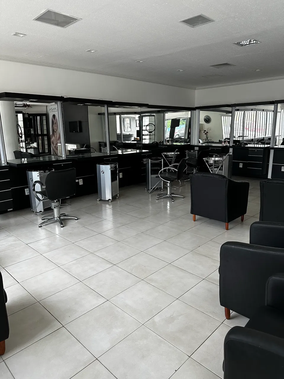 Bancada de cabeleireiro moderna e elegante, perfeita para salões de beleza. Design funcional e sofisticado, ideal para otimizar o espaço e oferecer conforto aos clientes.