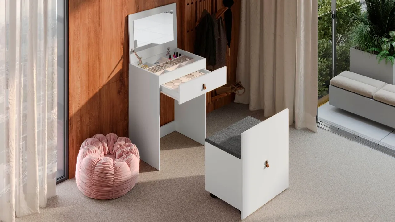 Linda penteadeira com design moderno e funcional, perfeita para organizar seus cosméticos e acessórios. Possui espelho e gavetas espaçosas para guardar tudo o que você precisa. Ideal para quem busca praticidade e elegância no dia a dia.