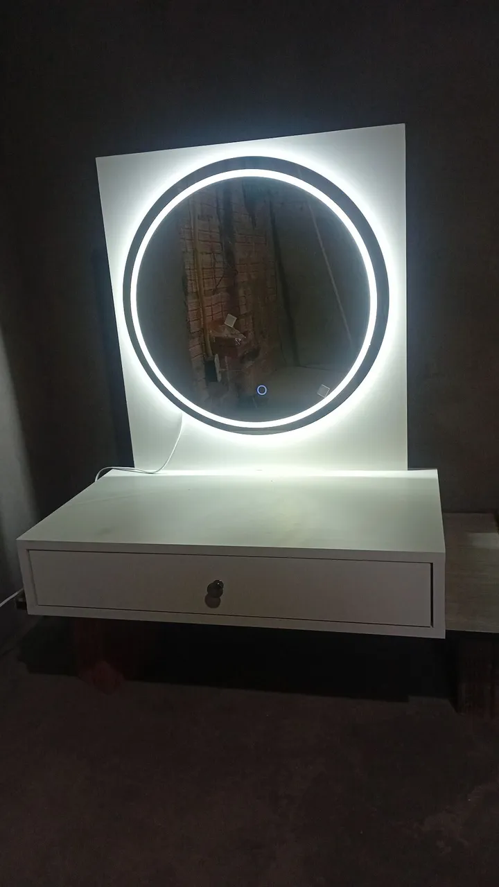 Linda penteadeira suspensa com espelho iluminado, perfeita para dar um toque de sofisticação ao seu quarto. Design moderno e funcional, ideal para otimizar o espaço e organizar seus itens de beleza. Iluminação embutida que valoriza a maquiagem e cria um ambiente agradável.