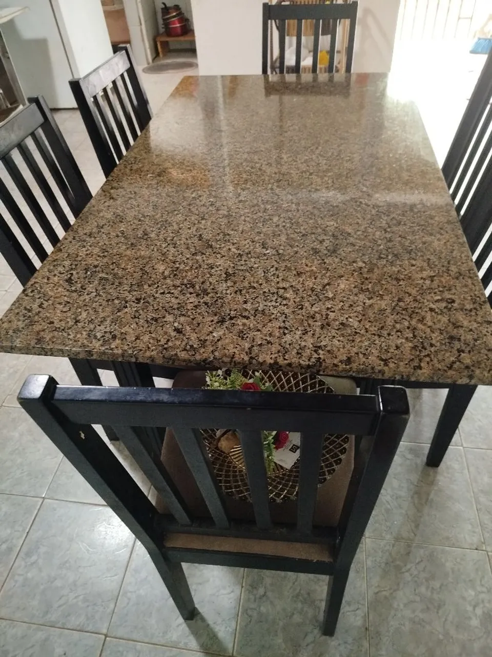 Linda mesa de jantar com tampo em granito, perfeita para reunir a família e amigos. Design elegante e durabilidade garantida. Deixe sua casa ainda mais charmosa!