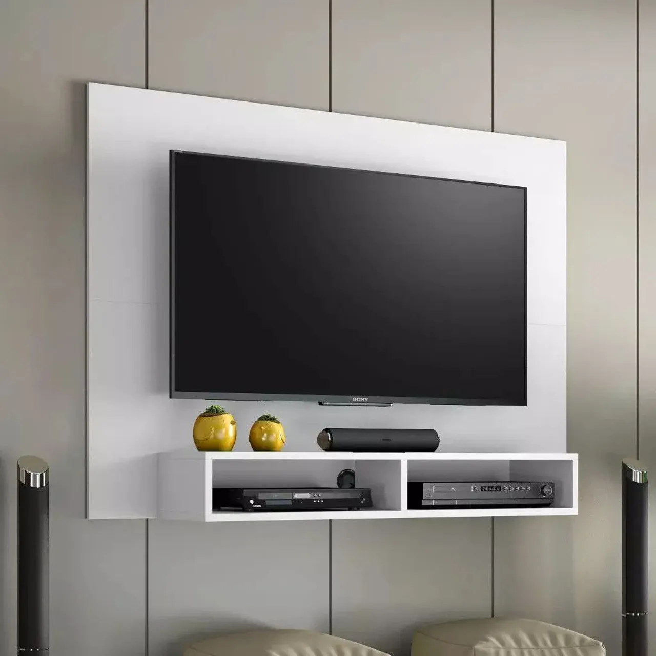 Rack para TV de parede, ideal para quem busca praticidade e modernidade. Possui design clean e elegante, com prateleiras para acomodar seus eletrônicos e objetos decorativos. Perfeito para complementar a decoração da sua sala.