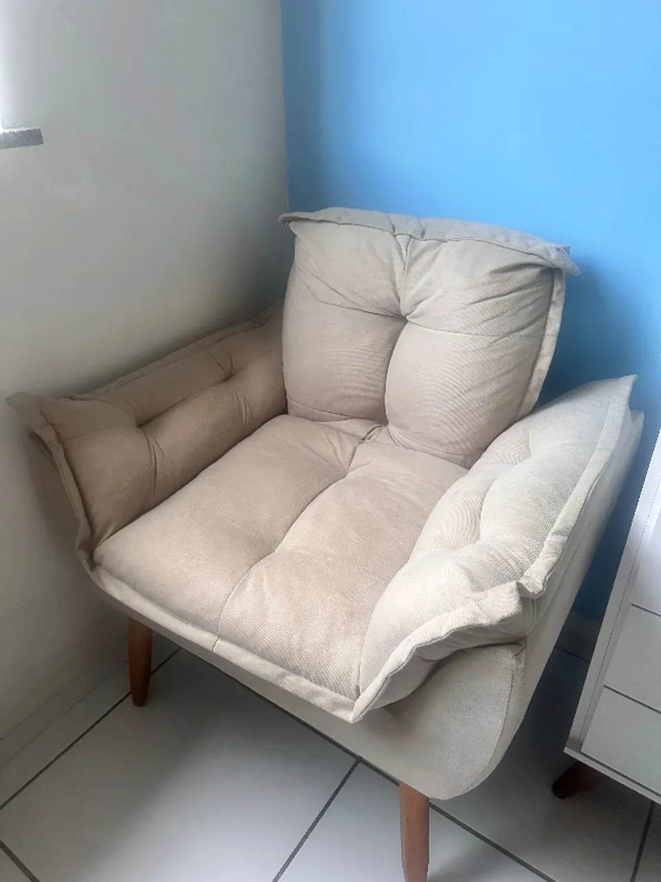 Poltrona cor cinza clara, sustentação nos braços. Pouco usado