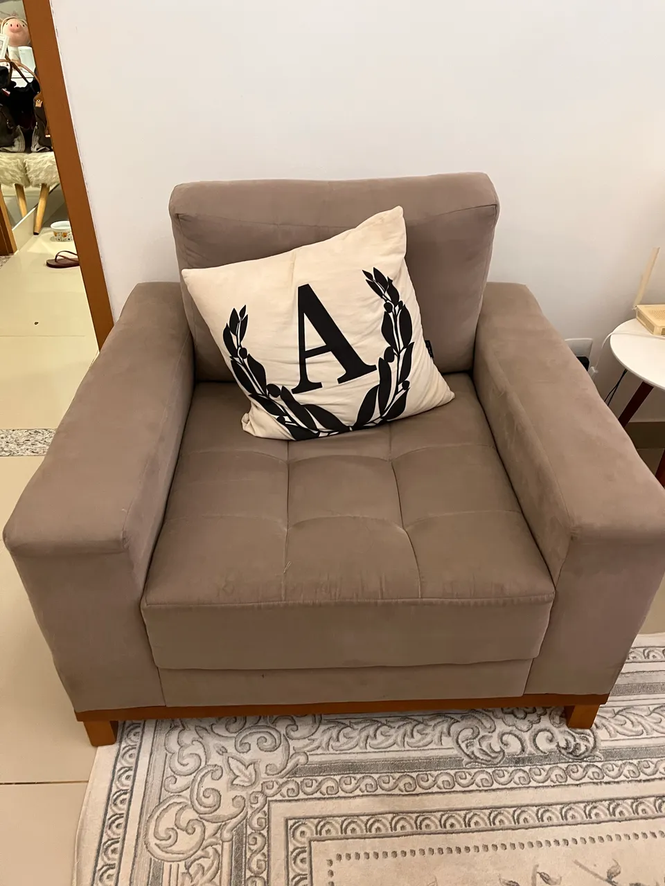 Poltrona Cinza, 1,0 x 0,92, o tecido tem alguns detalhes de uso