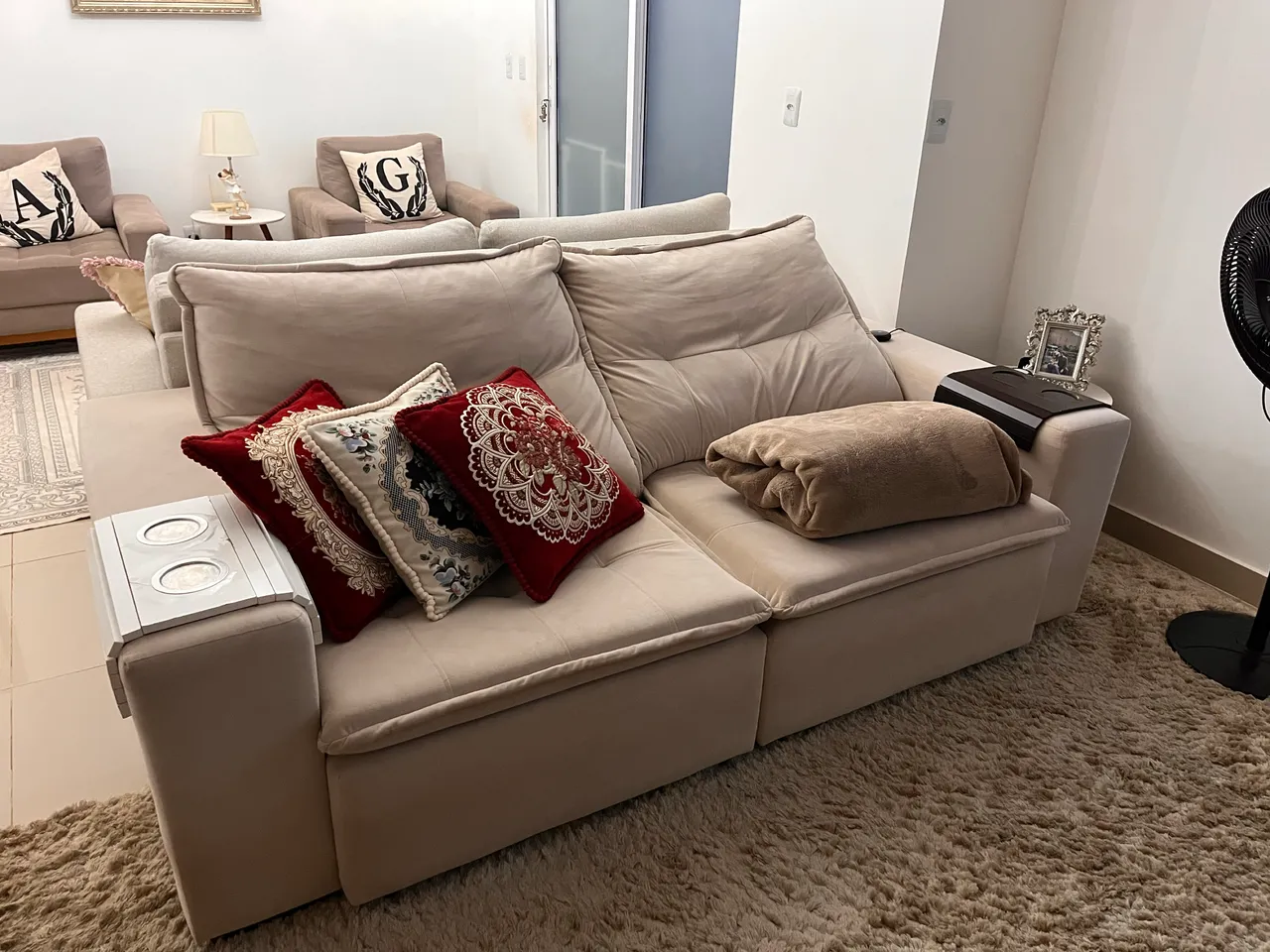 Sofá retrátil de 2,20m x 1,15m, tecido com detalhes de USO