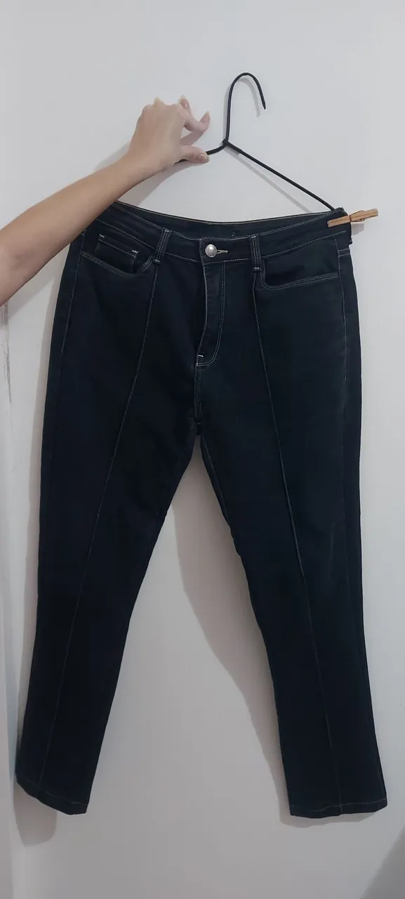 Calça jeans cintura baixa de lavagem escura, muito confortável. Ideal para quem busca um visual moderno, ela valoriza muito bem o corpo.